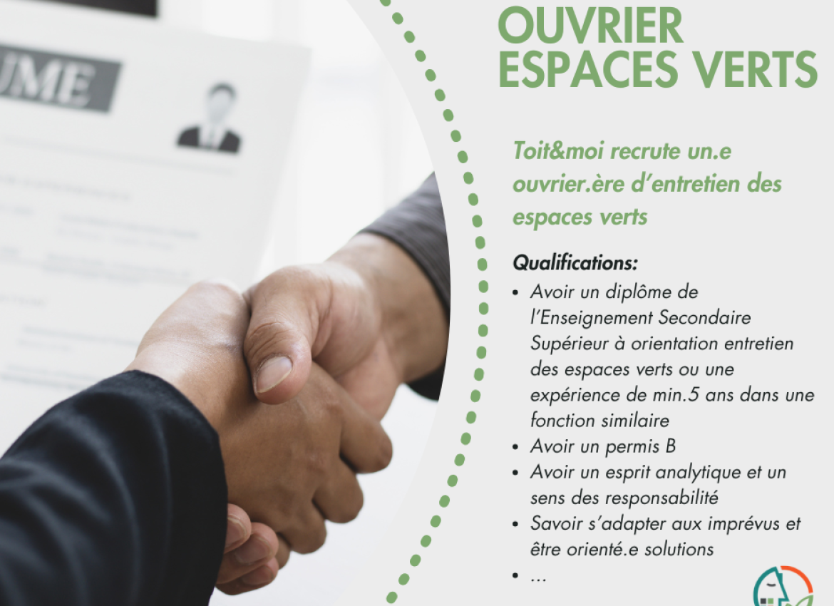Votre dossier de candidature (Intitulé de la fonction + lettre de motivation + CV + copie du diplôme) est à adresser à Gwenn LAZARE, Directrice RH, soit par e-mail, à l’adresse : recrutement@toitetmoi.be, soit par courrier postal recommandé : Toit & Moi – Avenue du Millénaire, 60 – 7011 Ghlin.